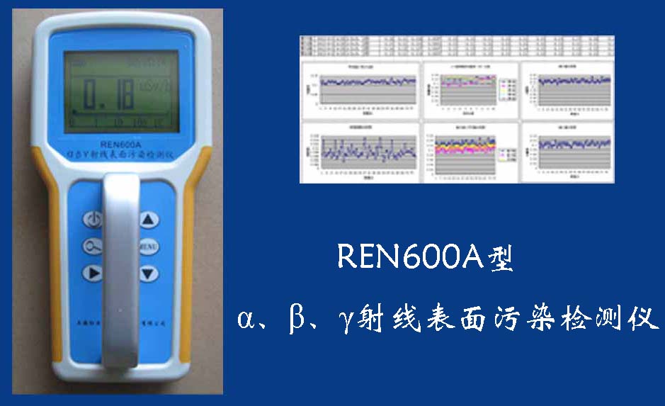REN600A型α、β、γ射線表面污染檢測(cè)儀即可檢測(cè)α、β、γ射線,也能檢測(cè)到X射線,它采用高速嵌入式微處器作為數(shù)據(jù)處理單元,點(diǎn)陣式大屏幕LCD液晶顯示,讀數(shù)清晰、操作方便,具有400條超大容量數(shù)據(jù)存儲(chǔ)。儀器采用進(jìn)口的大面積MICA蓋革探測(cè)器,具有較高探測(cè)效率,可進(jìn)行α、β輻射表面污染檢測(cè)和X、γ輻射劑量率的監(jiān)測(cè)。此外通過(guò)配套的RenriCont表面污染管理軟件可將存儲(chǔ)的數(shù)據(jù)讀出后分析。可廣泛用在制藥廠、實(shí)驗(yàn)室、發(fā)電廠、進(jìn)出口商檢、采石場(chǎng)、環(huán)境實(shí)驗(yàn)室、環(huán)境污染調(diào)查、核安全應(yīng)急、緊急狀況營(yíng)救站、金屬處理廠、地下油田、供油管道裝備、醫(yī)院核醫(yī)學(xué)科、同位素實(shí)驗(yàn)室、環(huán)境保護(hù)和警察局等部門(mén)。REN600A型α、β、γ射線表面